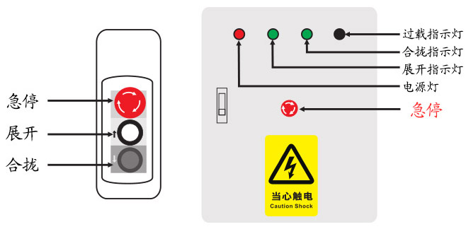 注:手柄開關(guān)使用方法為點(diǎn)動(dòng)。長(zhǎng)按合攏按鈕即可合攏,當(dāng)看臺(tái)徹底合攏時(shí),觸碰到限位開關(guān)會(huì)自動(dòng)停止。